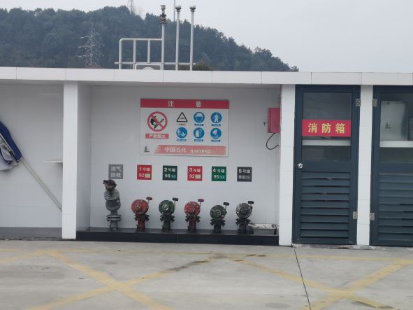加油站安裝有汽油卸油和加油油氣回收系統(tǒng)。加油區(qū)設置加油罩棚,罩棚為鋼架結構,罩棚下設置2臺三油品六槍潛油泵式加油機、1臺單油品四槍潛油泵式加油機、1臺雙油品四槍潛油泵式加油機、1臺尿素加注機;埋地罐區(qū)設有5只30m³埋地臥式鋼制單層油罐(防滲罐池內),其中汽油罐4只(分別為92#汽油罐2只、95#和98#汽油罐各1只),柴油罐1只,油罐總容積折算為135m3(柴油罐折半計入),根據(jù)《汽車加油加氣加氫站技術標準》GB50156-2021的相關規(guī)定,該加油站為二級加油站。